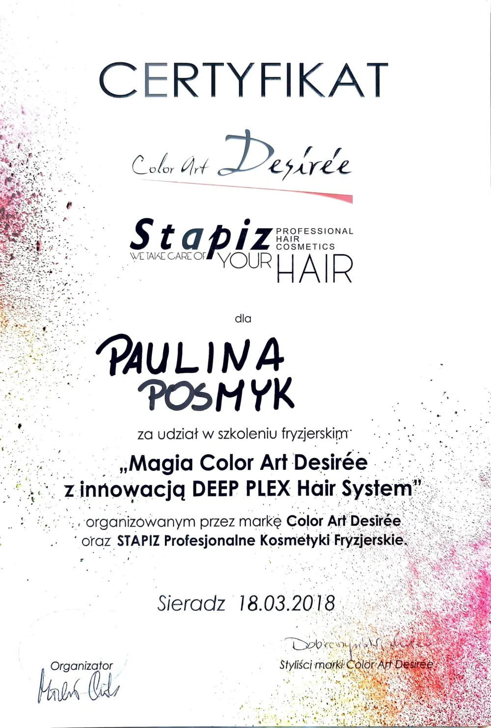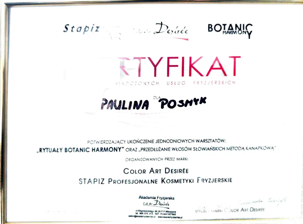 Już jako nastolatka wiedziałam, że chcę tworzyć coś więcej niż tylko fryzury – chciałam budować wizerunek i emocje. W 2010 roku ukończyłam Zasadniczą Szkołę Zawodową w Pajęcznie, zdobywając tytuł fryzjera czeladnika, a trzy lata później, w 2013 roku, ukończyłam Technikum Uzupełniające w Częstochowie, uzyskując kwalifikacje Technika Usług Fryzjerskich.