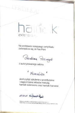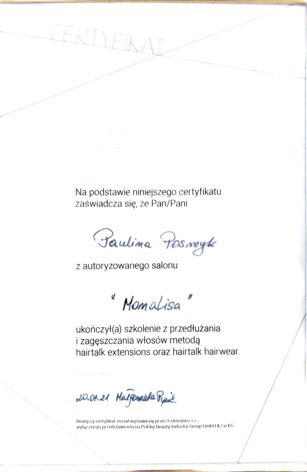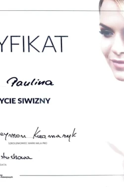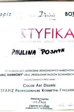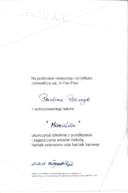 Poza klasycznym fryzjerstwem rozwijam się również w obszarze trychologii. Ukończyłam dwa poziomy kursów w Wawer Clinic / zbadjwlosy.pl, które pozwoliły mi lepiej zrozumieć zdrowie skóry głowy i strukturę włosa. Dzięki temu mogę działać holistycznie – nie tylko upiększać, ale też realnie pomagać.