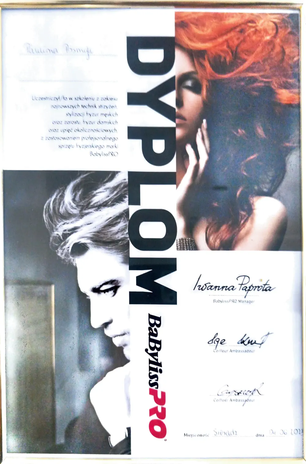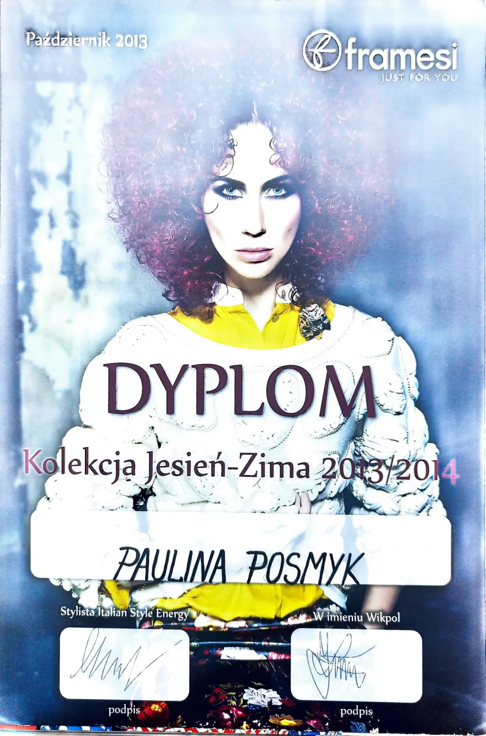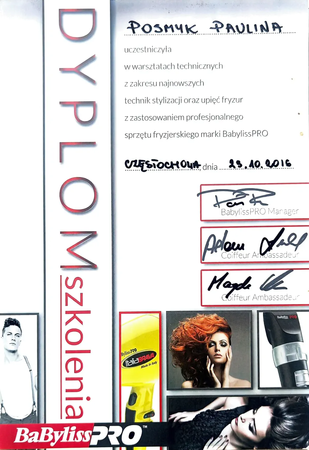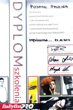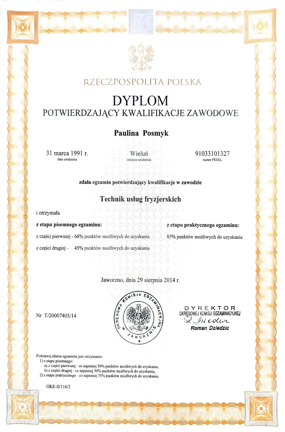 - Dyplom – Technik Usług Fryzjerskich, OKE Jaworzno (29.08.2014)