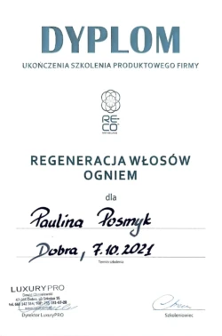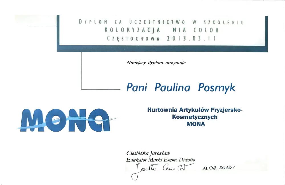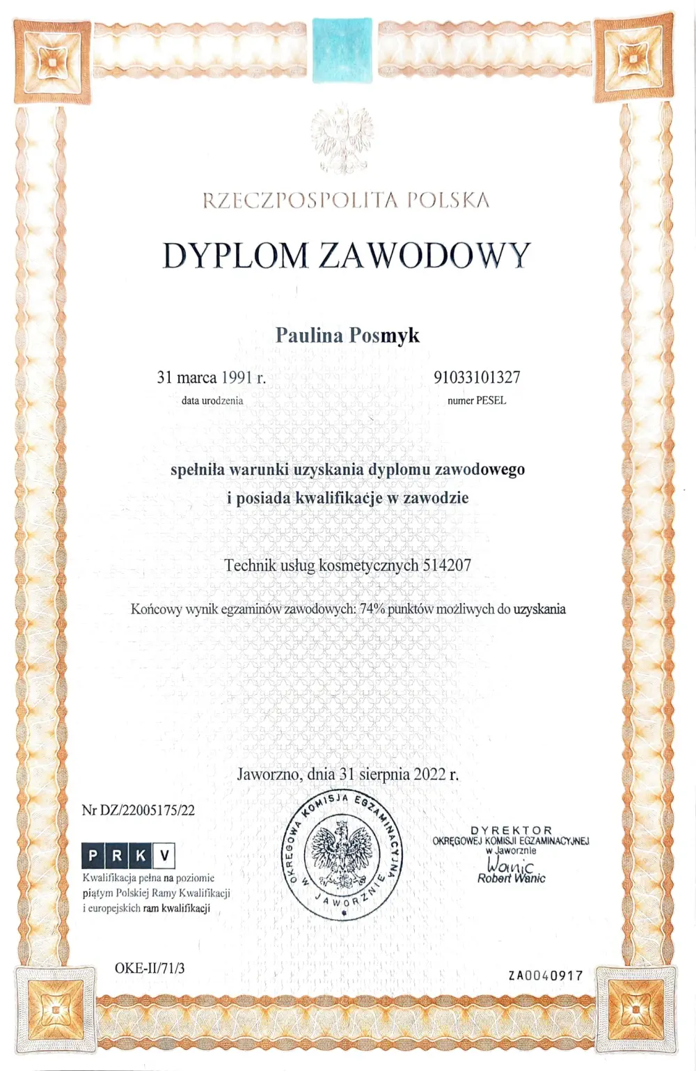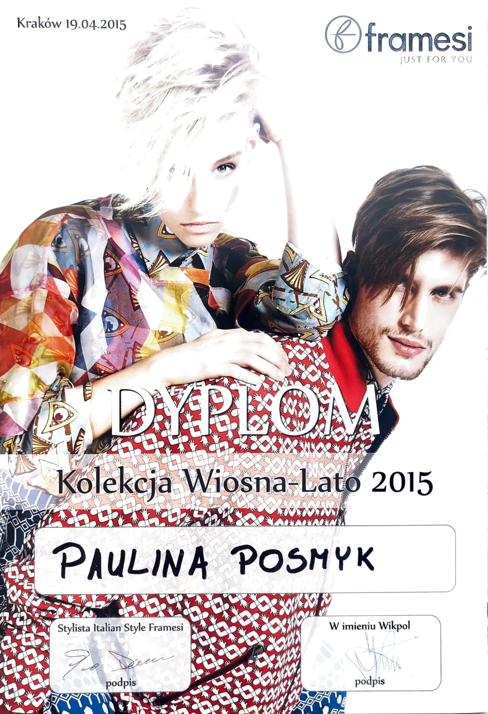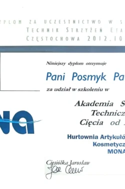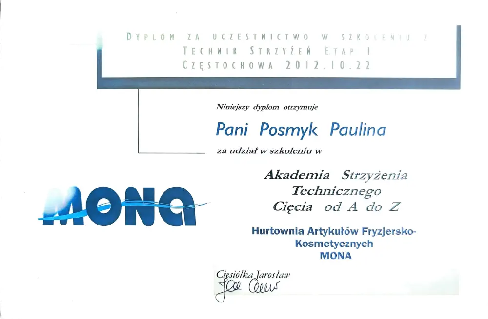 - Dyplom – Technik Usług Fryzjerskich, OKE Jaworzno (29.08.2014)