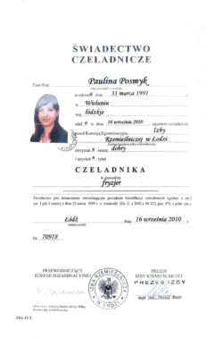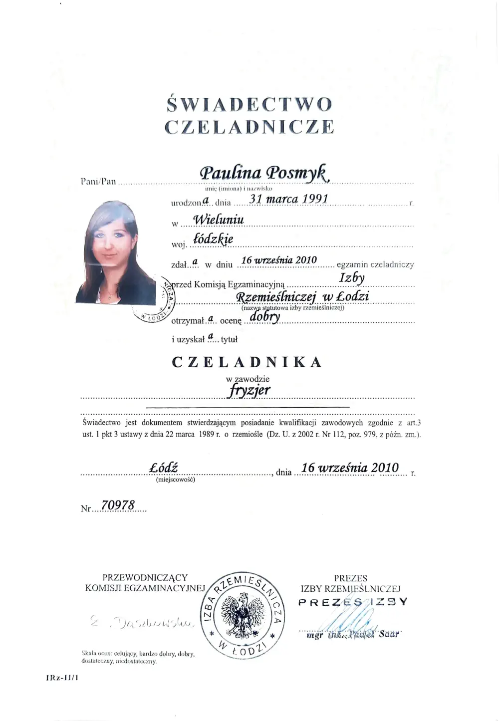 - Świadectwo Czeladnicze – Fryzjer, Izba Rzemieślnicza w Łodzi (16.09.2010)