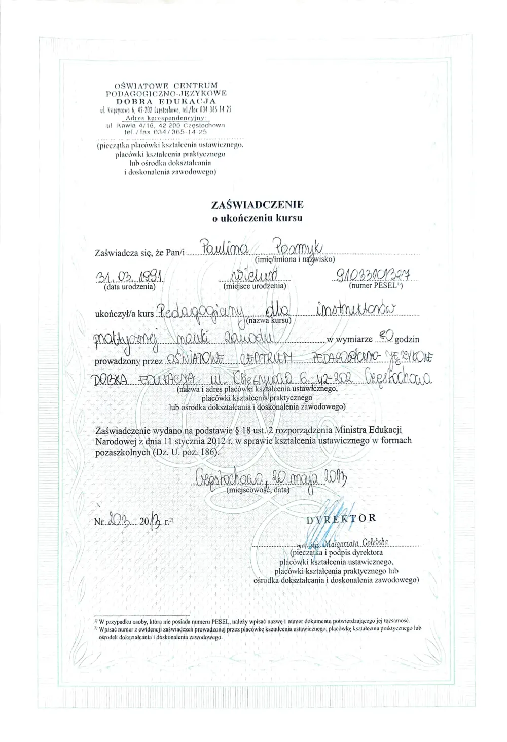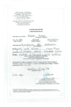 - Kurs pedagogiczny dla instruktorów praktycznej nauki zawodu (Oświatowe Centrum Dobra Edukacja, Częstochowa, 20.05.2017)